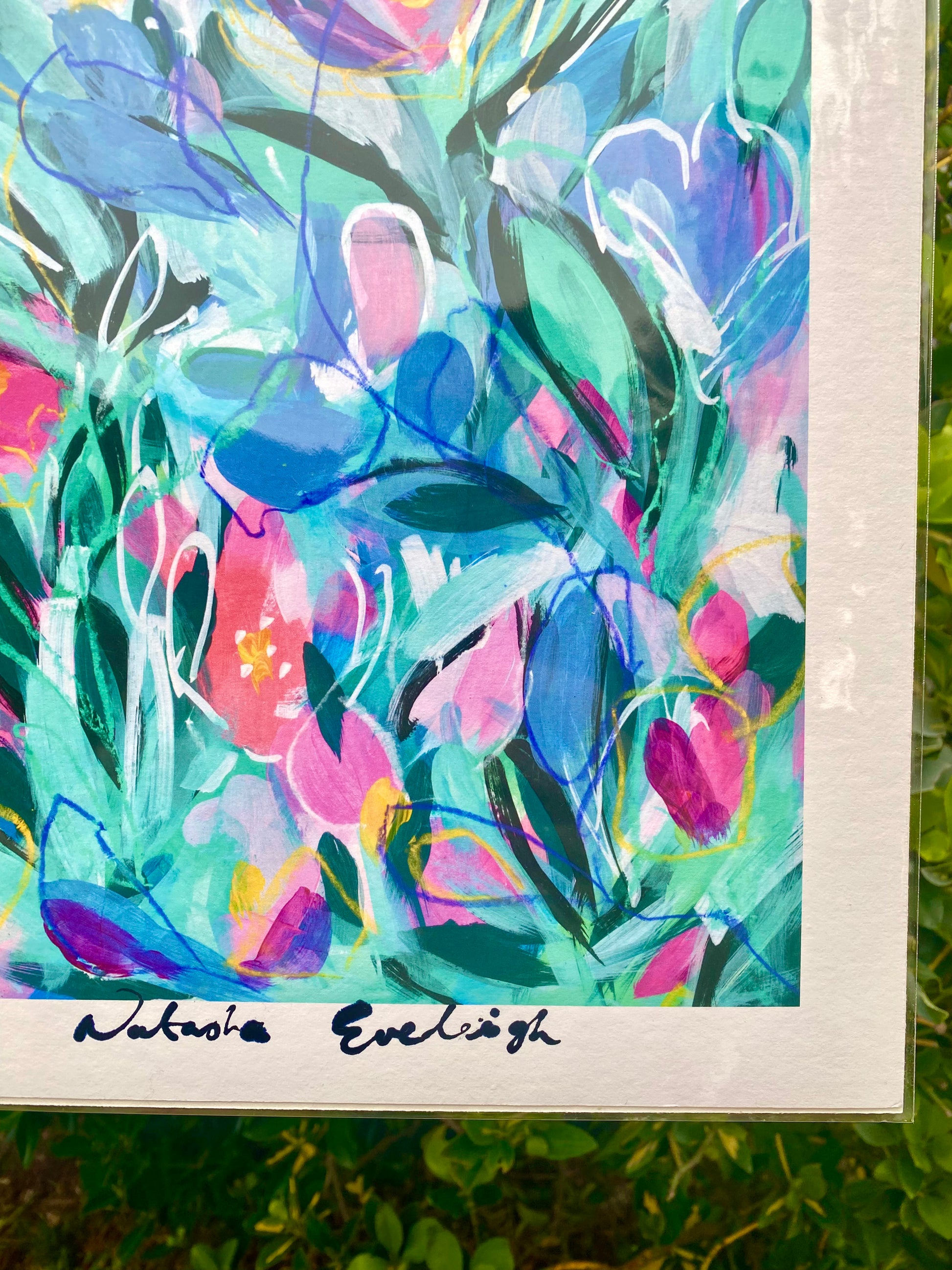 This product, Art Print - Pure Joy, features an abstract floral painting that was a pure joy to create. It has been used globally by the DOLCEZZA INC. Brand on a beautiful Spring clothing collection. The vibrant colours and dynamic brushstrokes exude energy, mainly in turquoise hues with bold pops of pink that are my signature style.