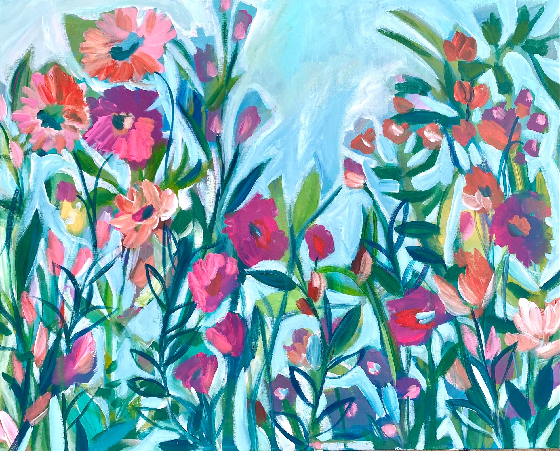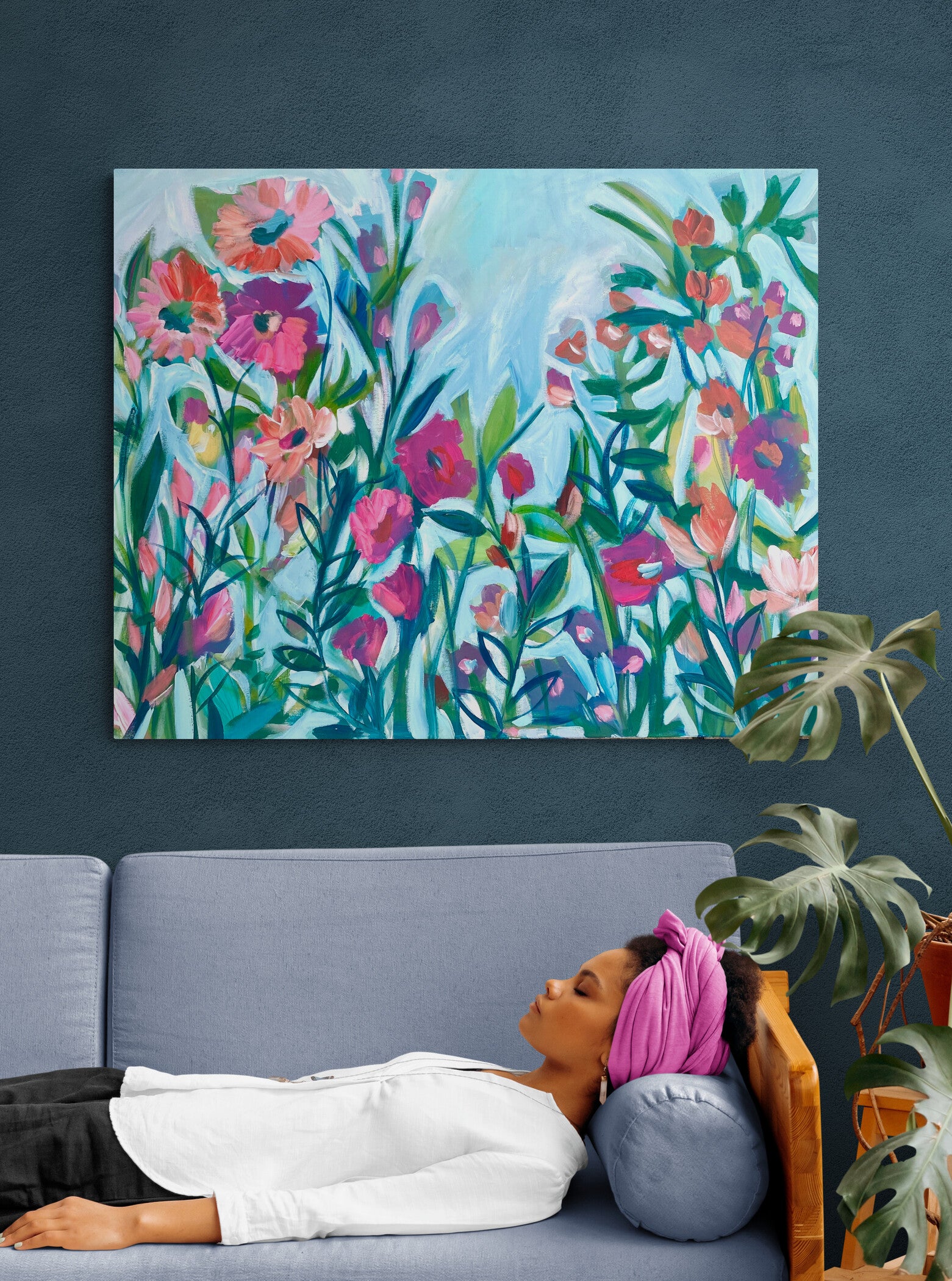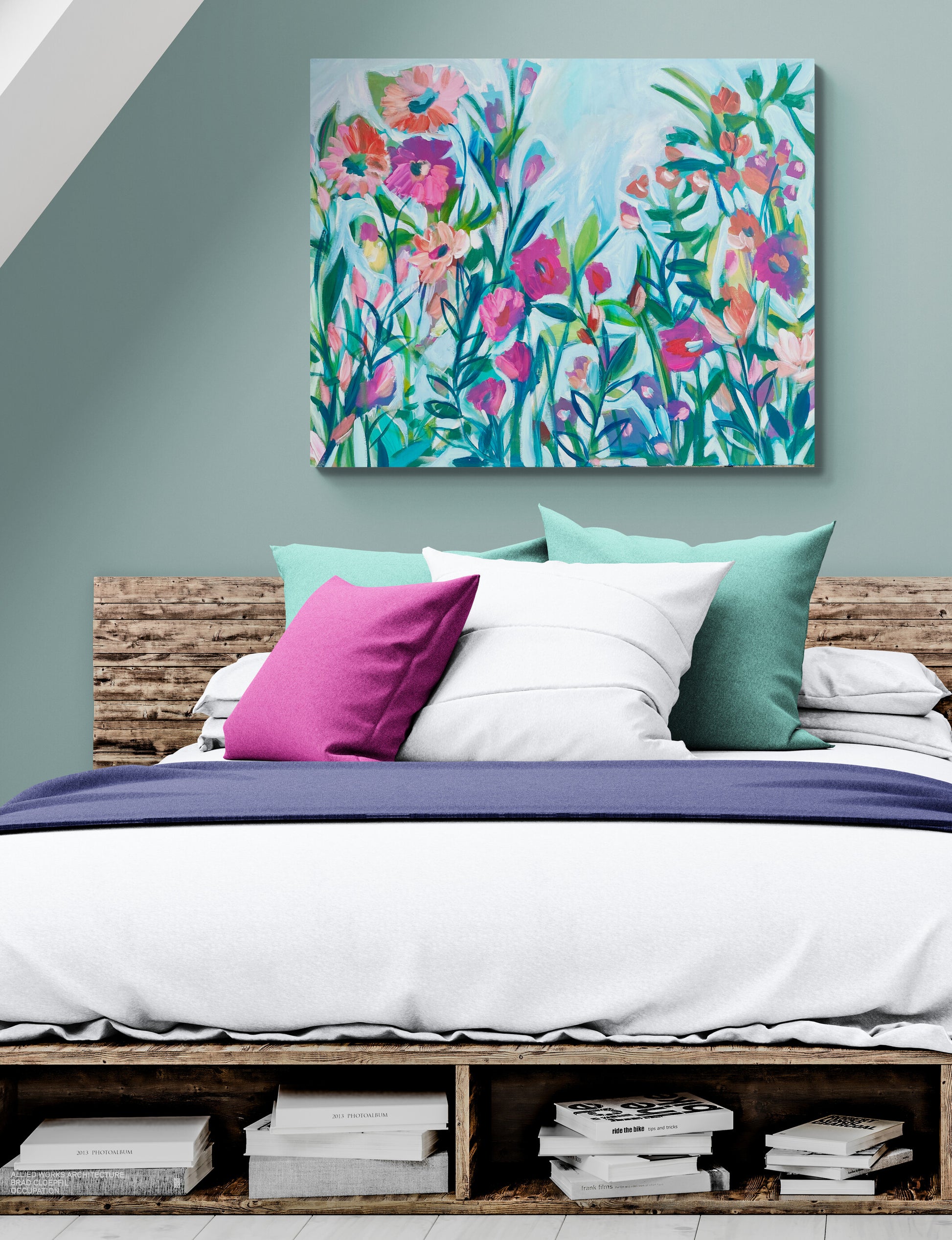 Add a vibrant energy to your space with my original abstract floral artwork on canvas. Featuring beautiful hues of pink, blue, and green, this piece is a stunning conversation starter. Bring life and movement to any room with this eye-catching artwork.