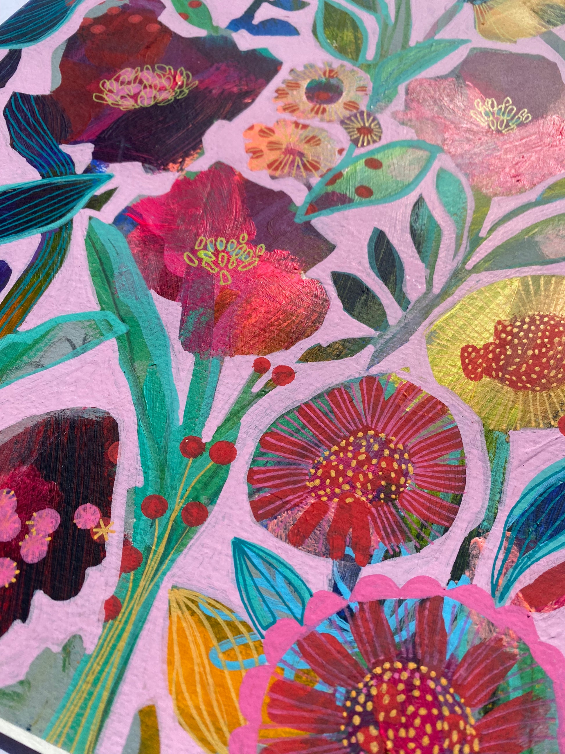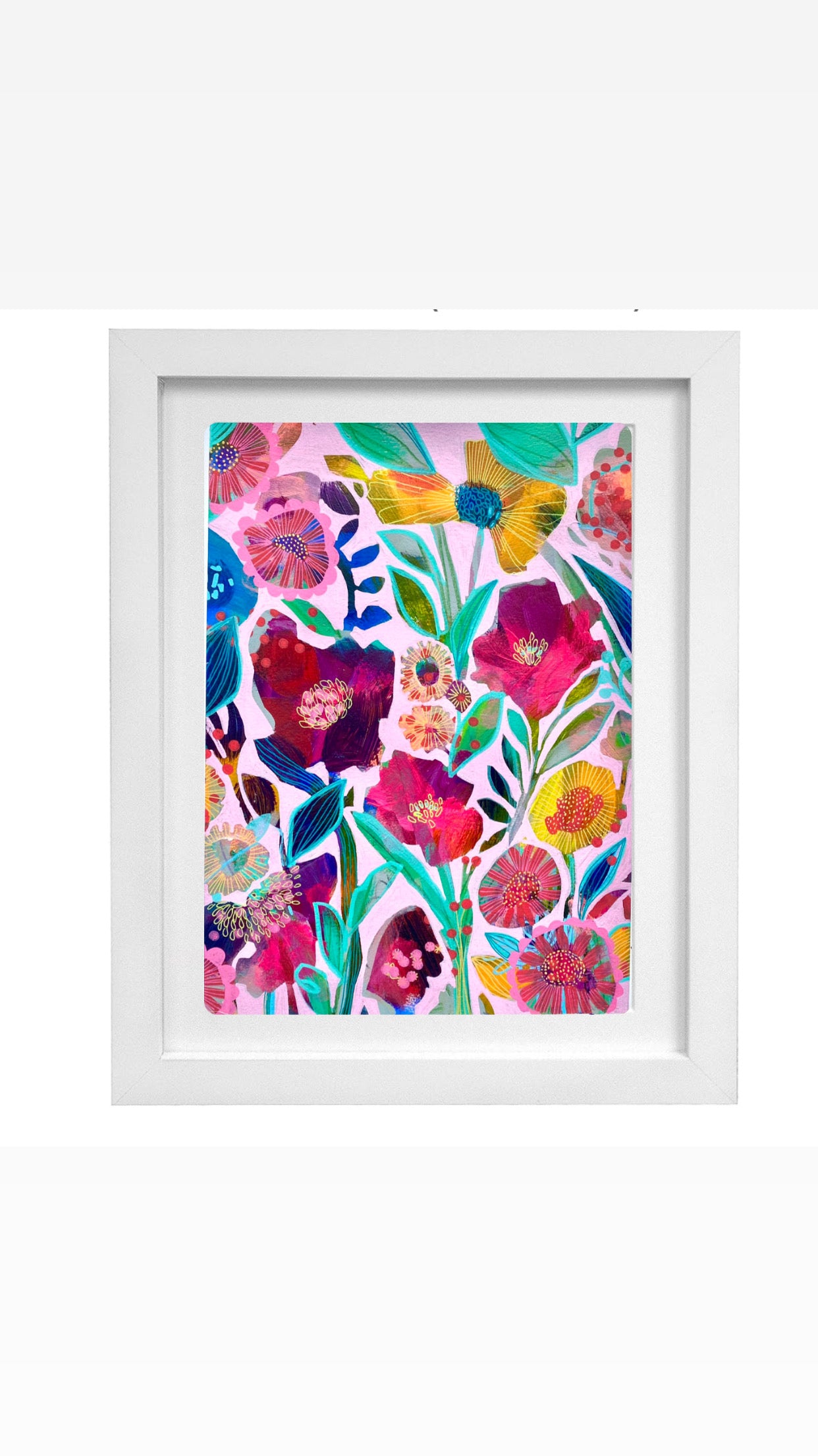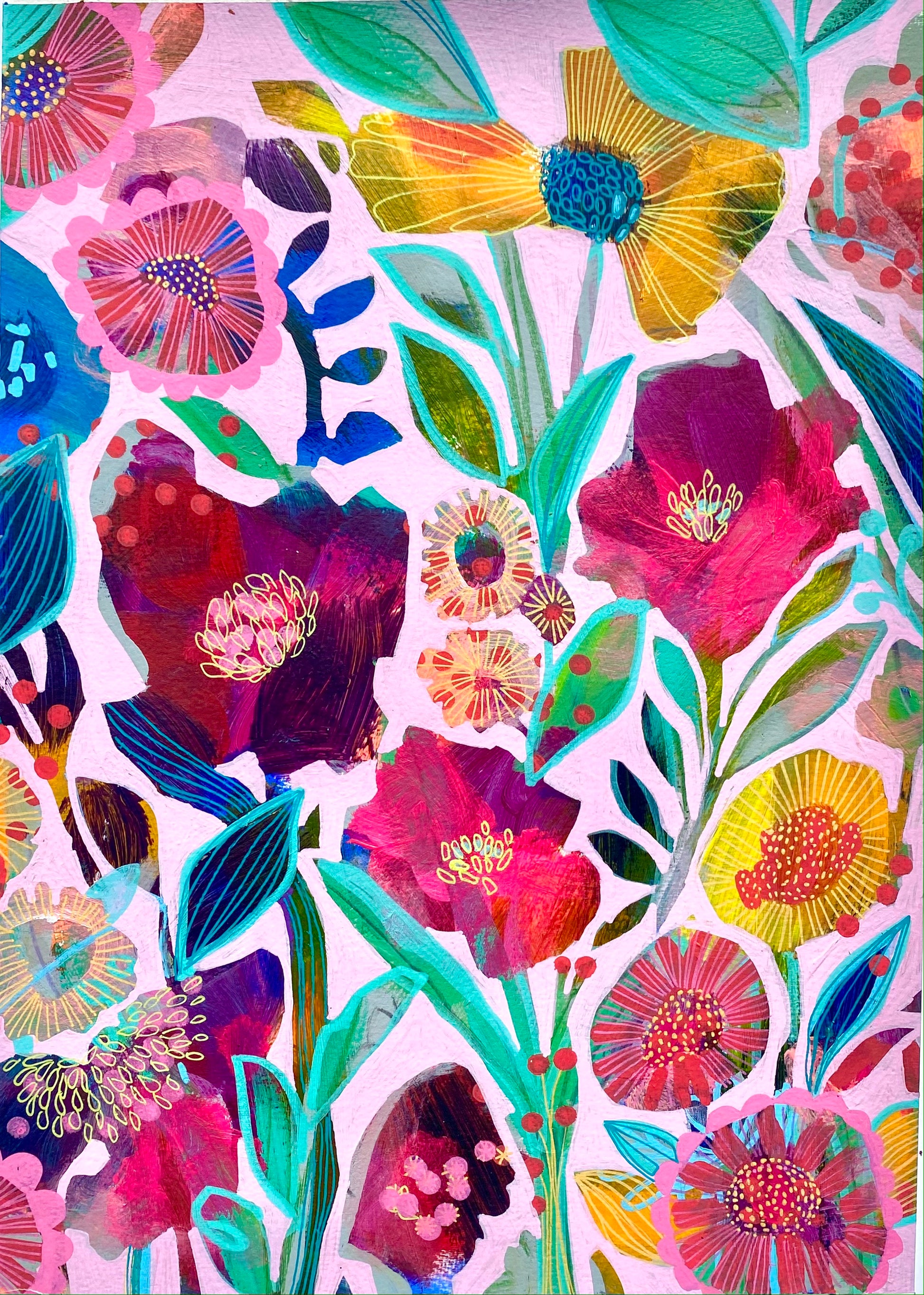 Be captivated by the whimsical beauty and charm of 'Pretty in Pink': an eye-catching original acrylic painting from the Posy Party Collection. Enjoy the exuberant combination of pink, green, blue and yellow that bring a fun and joyful atmosphere to any space. Bring your walls alive with this playful and uplifting abstract floral!